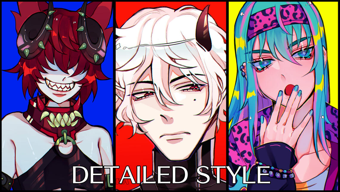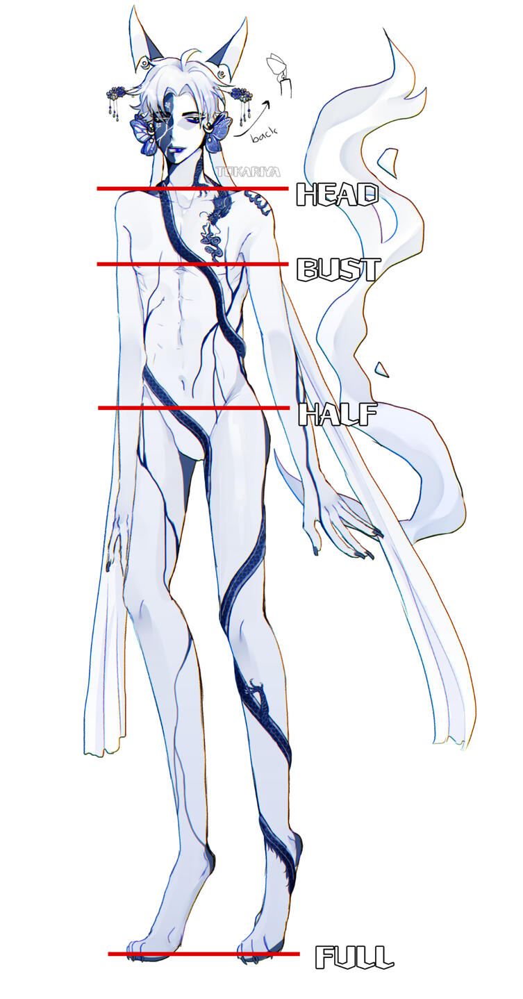Humans, humanoid species, flat-face anthros, and regular anthros are all okay. Complicated designs or additional objects/pets may have an additional $3-10 fee depending on how complicated it is.